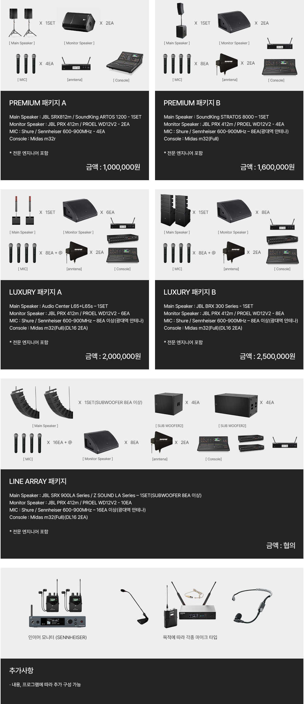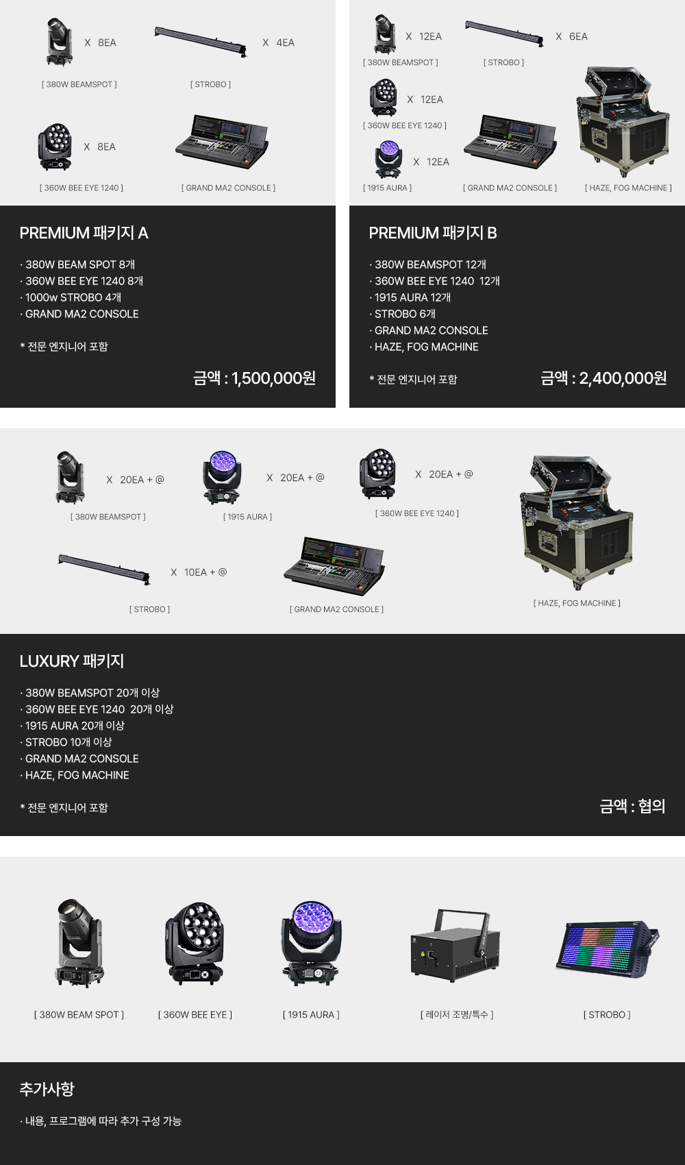 음향, 조명을 스펙별로 보유하고